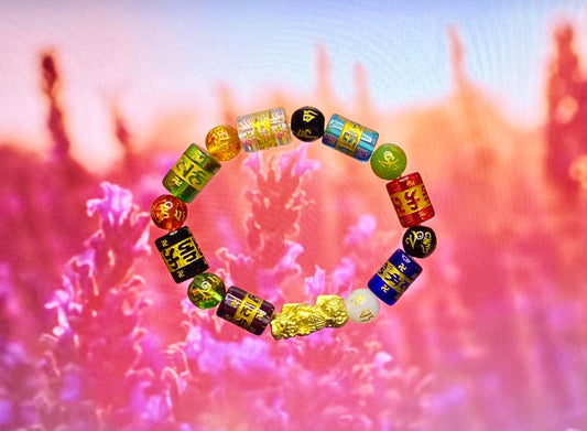 Tibetan Six-Word Mantra Carved Mixed Crystals Bracelet with 18K Gold-Plated Pi Yao