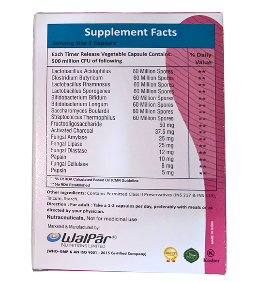 Walpar Digy Wal Digestive Enzyme Capsules 30 Capsules - Activated Charcoal + Probiotics & Prebiotics – Gut Health & Immunity Support – Relieves Bloating & Gas – Boosts Energy & Mood